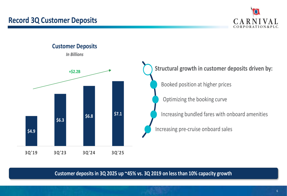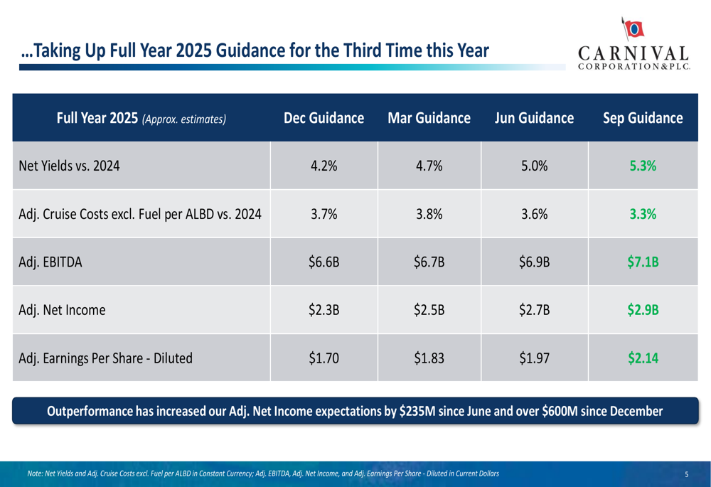 A Carnival superou significativamente suas projeções para o terceiro trimestre em todas as métricas-chave. A empresa alcançou receitas recordes, rendimentos líquidos, EBITDA ajustado, lucro operacional e depósitos de clientes, tudo isso operando com capacidade 2,5% menor que no 3º tri 2024.