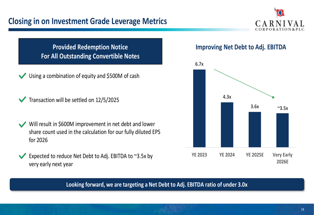 As classificações de crédito da Carnival viram múltiplas elevações das três principais agências no último ano, colocando a empresa a apenas um nível do grau de investimento com S&P e Fitch. A empresa também está se aproximando das métricas de alavancagem de grau de investimento, com a relação dívida líquida para EBITDA ajustado prevista para atingir aproximadamente 3,5x no início de 2026.