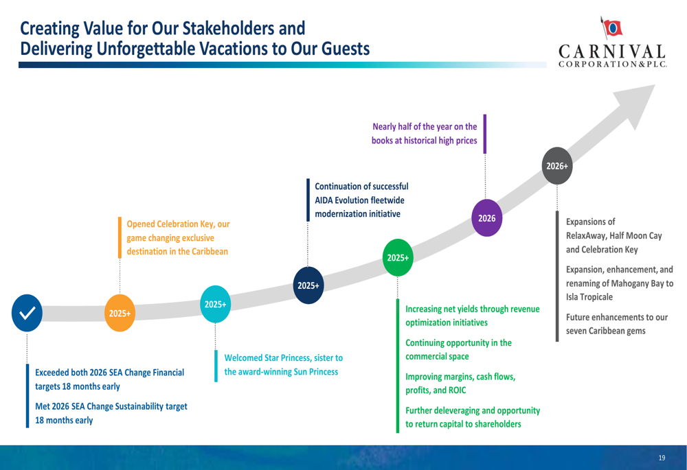 A Carnival continua fortalecendo sua posição competitiva através de investimentos estratégicos em destinos exclusivos e expansão da frota. A empresa recentemente inaugurou o Celebration Key, que abriu no prazo e dentro do orçamento, e já recebeu quase meio milhão de hóspedes com feedback positivo.