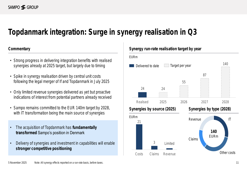 A apresentação destacou várias iniciativas estratégicas que contribuíram para o forte desempenho da Sampo. A integração da Topdanmark está progredindo à frente do cronograma, com a realização de sinergias já alcançando a meta de 2025 após a fusão legal em julho de 2025.