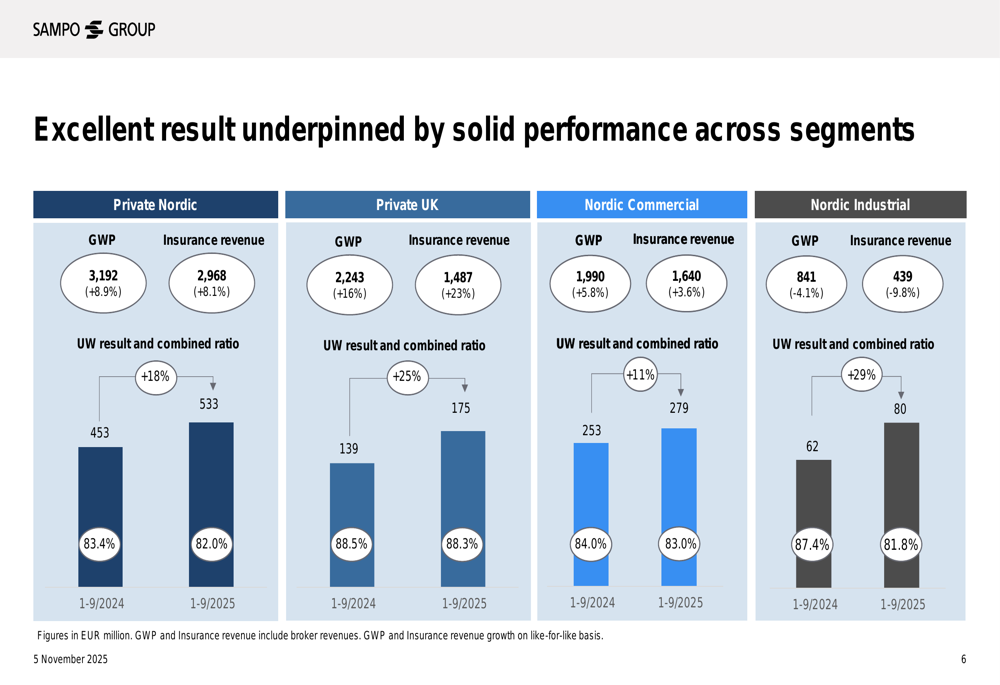 A apresentação da Sampo forneceu um detalhamento detalhado do desempenho em seus principais segmentos de negócios, todos mostrando melhoria nos resultados de subscrição e índices combinados.