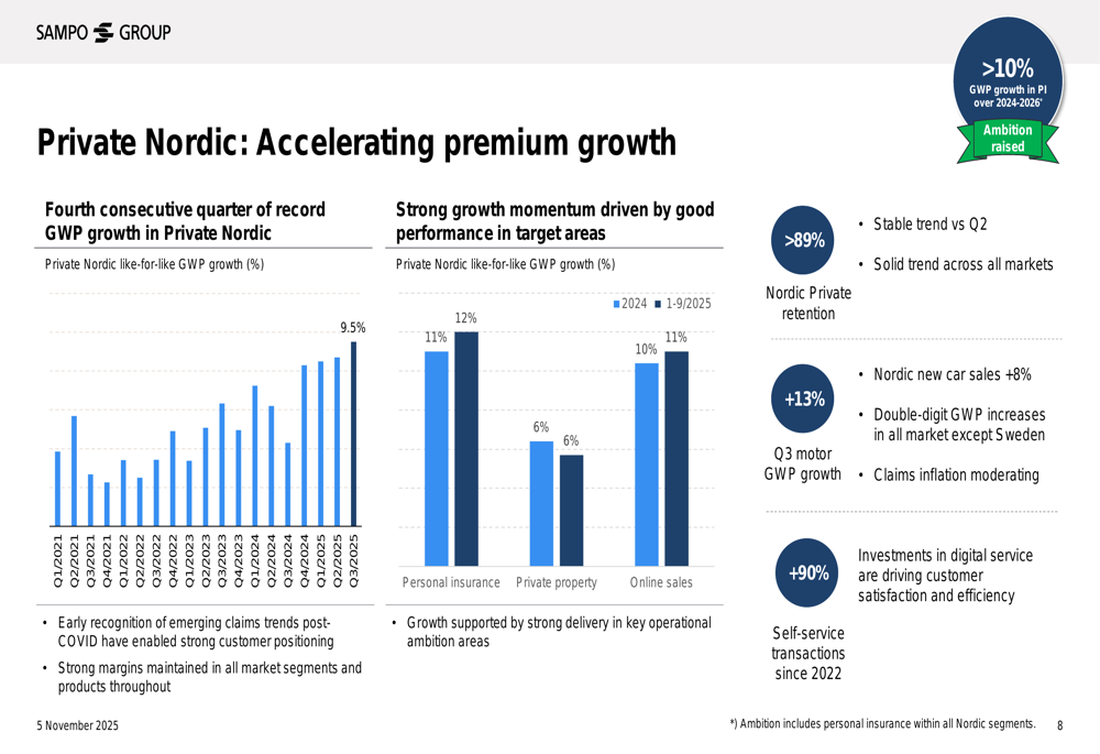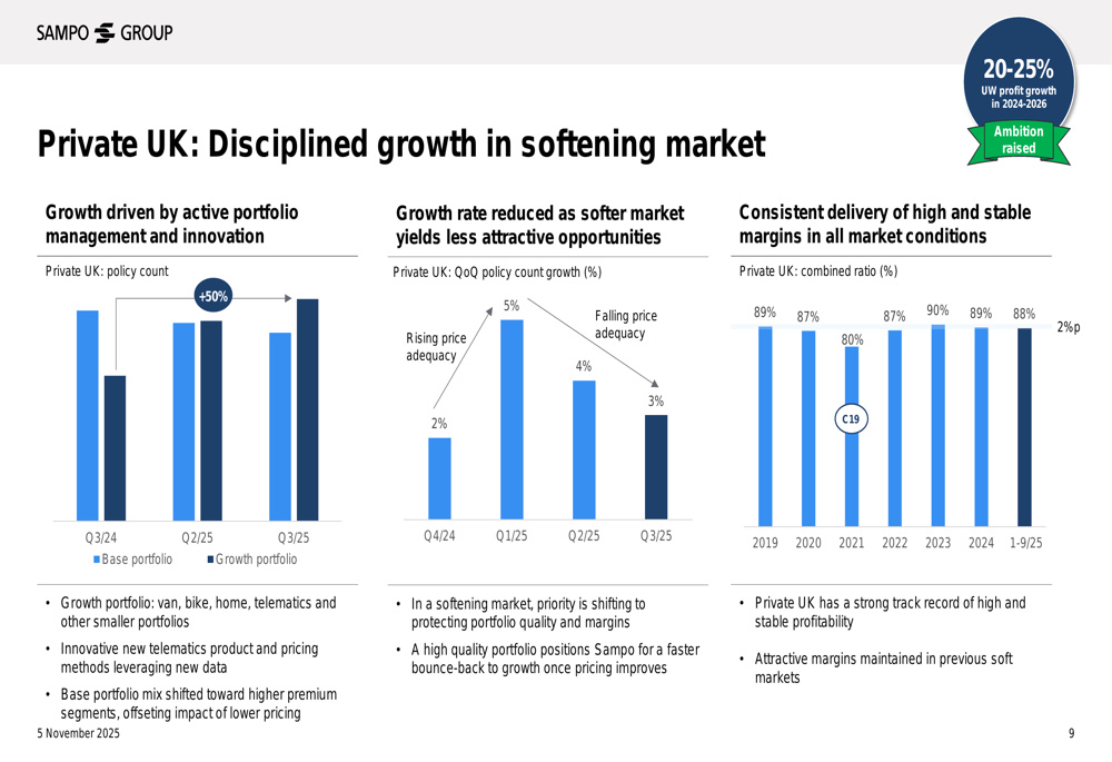 A apresentação destacou o contínuo impulso da Sampo nas linhas de seguros privados e para PMEs, com crescimento particularmente forte na região nórdica e nos mercados do Reino Unido. Este desempenho ocorre em meio à moderação da inflação de sinistros e ao que a administração descreveu como "competição racional" nos mercados nórdicos, enquanto navega em um ambiente de seguros automotivos "em desaceleração" no Reino Unido.