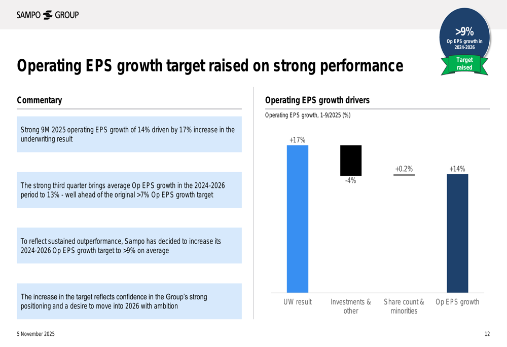 Com base em seu forte desempenho, a Sampo elevou sua meta de crescimento do LPA operacional para 2024-2026 para mais de 9% ao ano em média, acima da meta anterior de mais de 7%. Este aumento reflete a confiança da administração na estratégia de crescimento da empresa e nas melhorias operacionais.