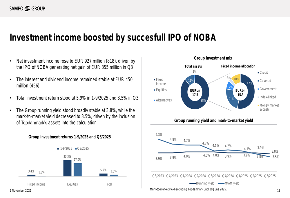 O índice de solvência da empresa ficou em 172%, ligeiramente abaixo em 2 pontos percentuais em relação ao 2º tri de 2025, mas ainda indicando uma forte posição de capital. Este sólido desempenho permitiu à Sampo anunciar um novo programa de recompra de ações de € 150 milhões, financiado pelos recursos do IPO da NOBA.