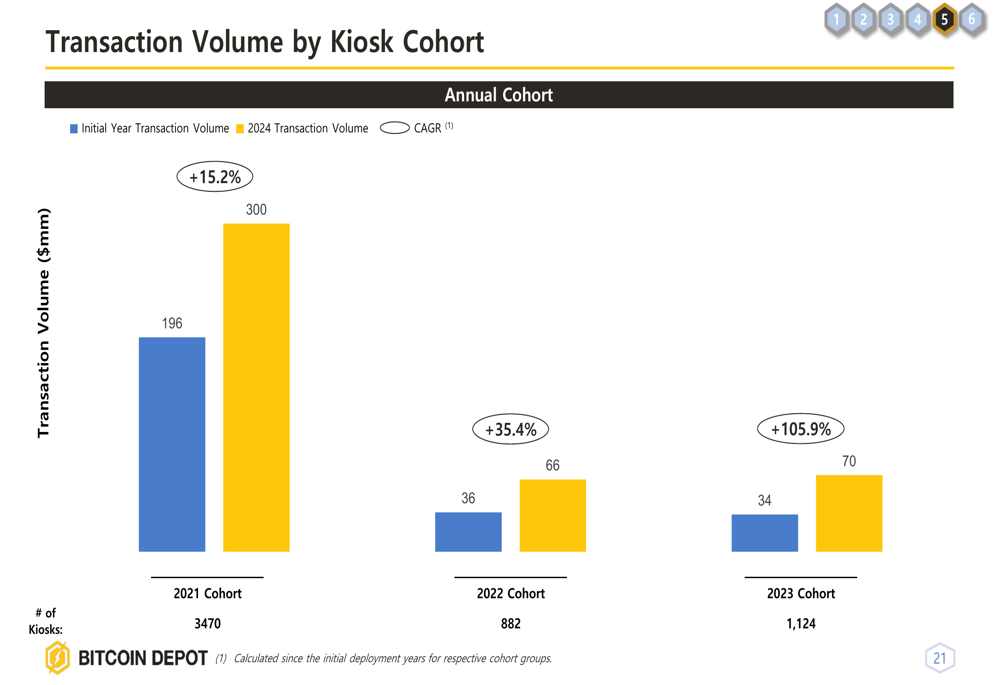 As coortes de quiosques da Bitcoin Depot demonstraram forte crescimento ao longo do tempo, com a coorte de 2021 (3.470 quiosques) alcançando um CAGR de 15,2%, a coorte de 2022 (882 quiosques) crescendo a 35,4%, e a coorte de 2023 (1.124 quiosques) expandindo a impressionantes 105,9%.