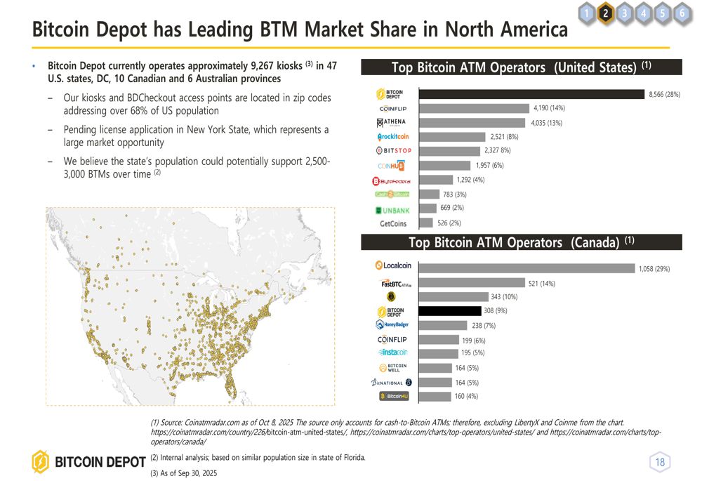 A Bitcoin Depot mantém sua posição como líder de mercado nos Estados Unidos com 28% de participação, operando 8.566 BTMs. No Canadá, a empresa é a terceira maior operadora com 10% de participação no mercado (343 BTMs), enquanto também se expande para a Austrália.