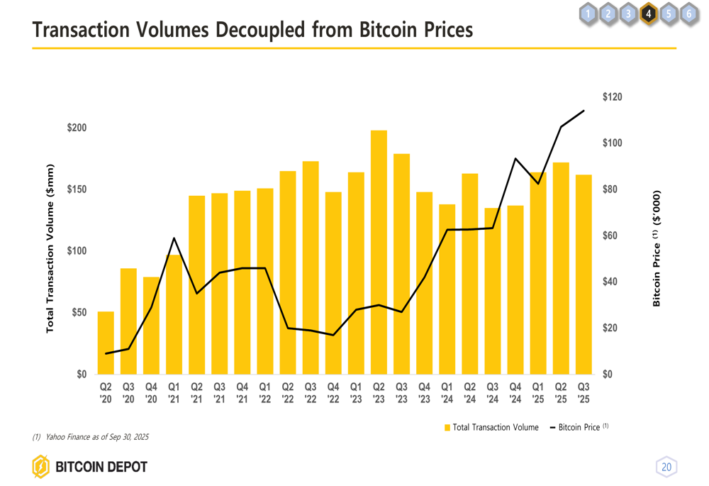 O balanço da empresa permanece sólido com US$ 72,9 milhões em dinheiro e ativos digitais. A Bitcoin Depot alcançou um volume total de transações de US$ 3,3 bilhões desde sua fundação, com 4,0 milhões de transações totais realizadas.