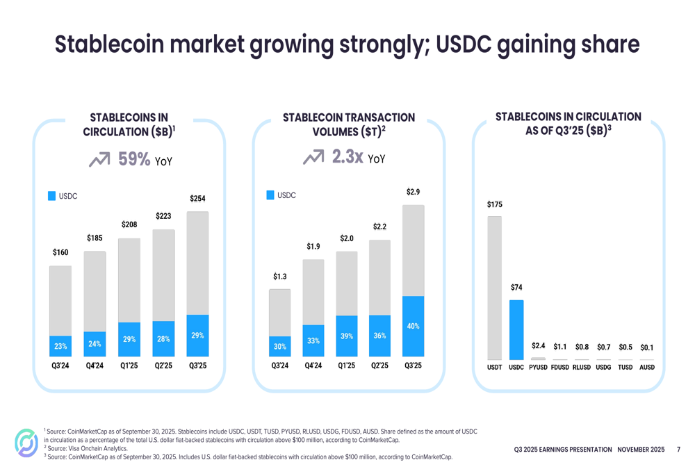 A apresentação da Circle destacou a crescente participação de mercado da empresa no ecossistema de stablecoins. A participação do USDC no total de stablecoins em circulação aumentou de 23% no 3º tri de 2024 para 29% no 3º tri de 2025, enquanto sua participação nos volumes de transações cresceu de 30% para 40% durante o mesmo período.