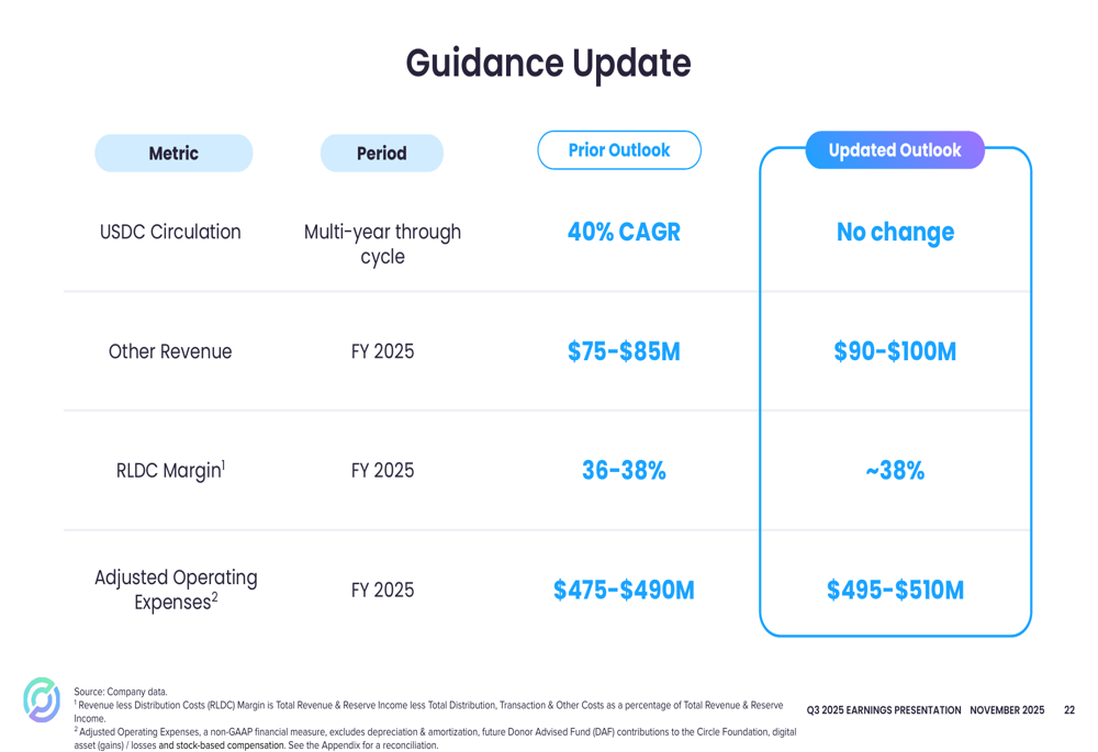 A Circle atualizou suas projeções para o ano fiscal de 2025, mantendo sua meta de crescimento plurianual de circulação do USDC de 40% CAGR, mas aumentando as projeções tanto de receita quanto de despesas: