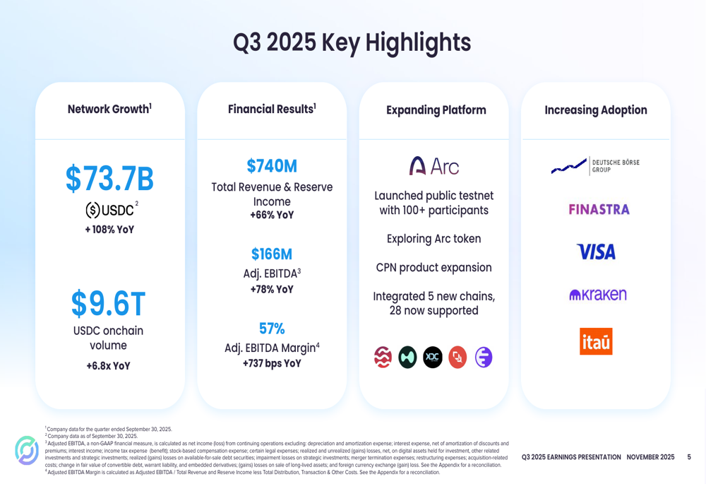 A Circle reportou receita total e renda de reservas de US$ 740 milhões para o 3º tri de 2025, representando um aumento de 66% em relação ao ano anterior. O EBITDA ajustado alcançou US$ 166 milhões, um crescimento de 78% em comparação ao mesmo período do ano passado, com margem EBITDA ajustada de 57%, expandindo 737 pontos base em relação ao ano anterior.