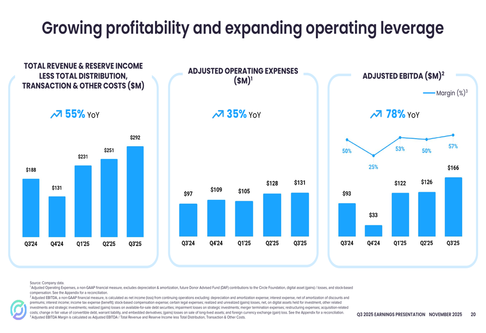 O desempenho financeiro da Circle mostra forte crescimento com alavancagem operacional aprimorada. O crescimento da receita superou o crescimento das despesas, levando à expansão das margens e ao aumento da lucratividade: