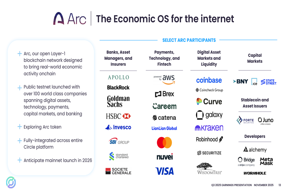 Um foco significativo da apresentação da Circle foi sua plataforma Arc, descrita como "O Sistema Operacional Econômico para a Internet". Arc é uma rede blockchain Layer-1 aberta projetada para trazer atividade econômica do mundo real para o blockchain, com uma testnet pública já lançada contando com mais de 100 empresas participantes.