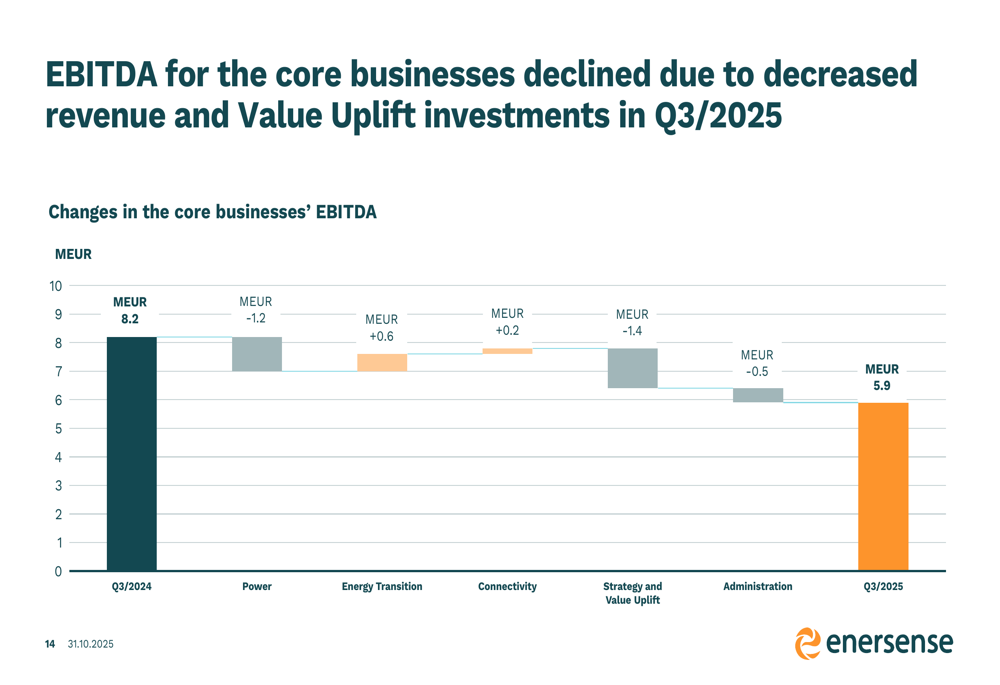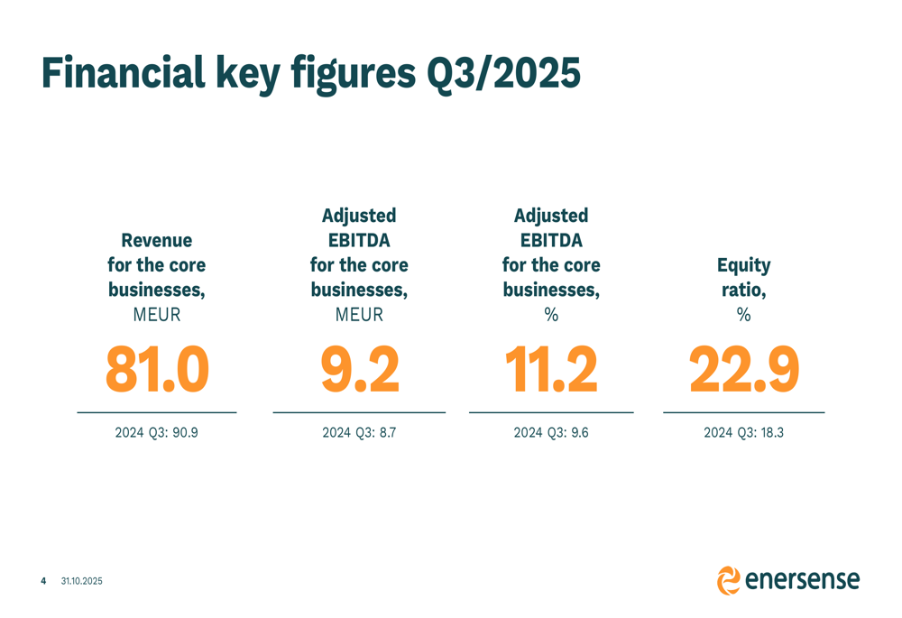 A Enersense reportou uma queda de 10% na receita anual em seus negócios principais para € 81 milhões no 3º tri de 2025, abaixo dos € 90,9 milhões no mesmo período do ano passado. No entanto, a empresa conseguiu melhorar sua margem de EBITDA ajustada para 11,2%, contra 9,6% no 3º tri de 2024, demonstrando maior eficiência operacional em meio a condições desafiadoras de mercado.