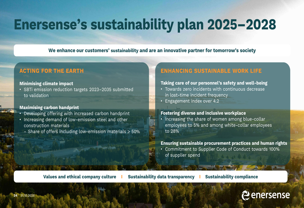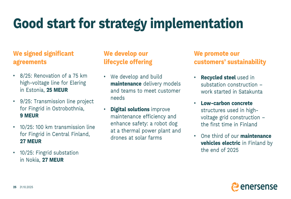 A Enersense também destacou sua transição para uma estratégia de parceria de ciclo de vida para 2025-2028, que envolve a atualização da estratégia dos negócios principais, renovação do modelo operacional e desenvolvimento de um roteiro operacional para 2026-2028.