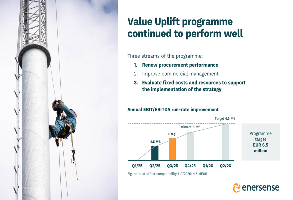 Um foco principal da apresentação da Enersense foi seu programa Value Uplift, que visa proporcionar melhorias anuais na taxa de execução de EBIT/EBITDA de € 4 milhões até o final do 3º tri de 2025. O programa concentra-se em três fluxos principais: renovação do desempenho de compras, melhoria da gestão comercial e avaliação de custos fixos e recursos para apoiar a implementação da estratégia.