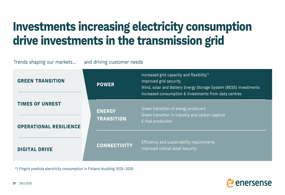A apresentação enfatizou várias tendências de mercado que impulsionam as necessidades dos clientes, incluindo a transição verde, requisitos de resiliência operacional e digitalização crescente. Notavelmente, a empresa citou a previsão da Fingrid de que o consumo de eletricidade na Finlândia dobrará entre 2025 e 2035, criando oportunidades significativas na expansão da capacidade da rede.