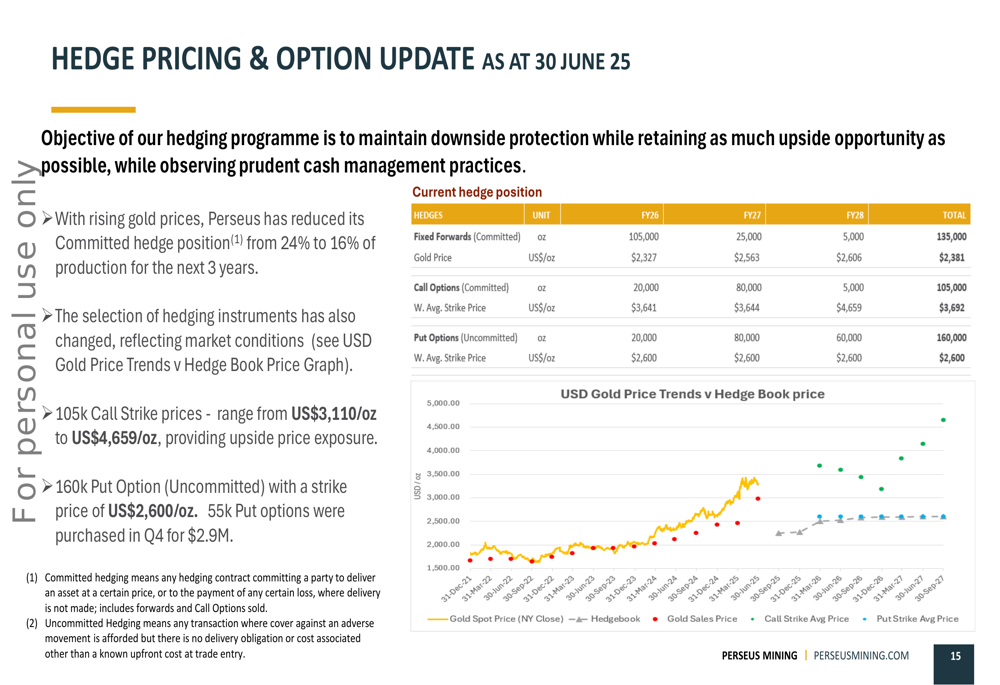 A Perseus também ajustou sua estratégia de hedge em resposta ao aumento dos preços do ouro, reduzindo sua posição de hedge comprometida de 24% para 16% da produção para os próximos três anos: