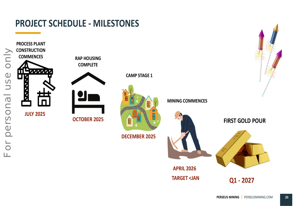 A construção da usina de processamento está programada para começar em julho de 2025, com operações de mineração iniciando em abril de 2026 e a primeira fundição de ouro esperada para o 1º tri de 2027. Uma vez operacional, projeta-se que Nyanzaga produza 725.000-750.000 onças durante seus primeiros cinco anos a um AISC de US$ 1.230-1.330 por onça, tornando-se o ativo de menor custo da Perseus.