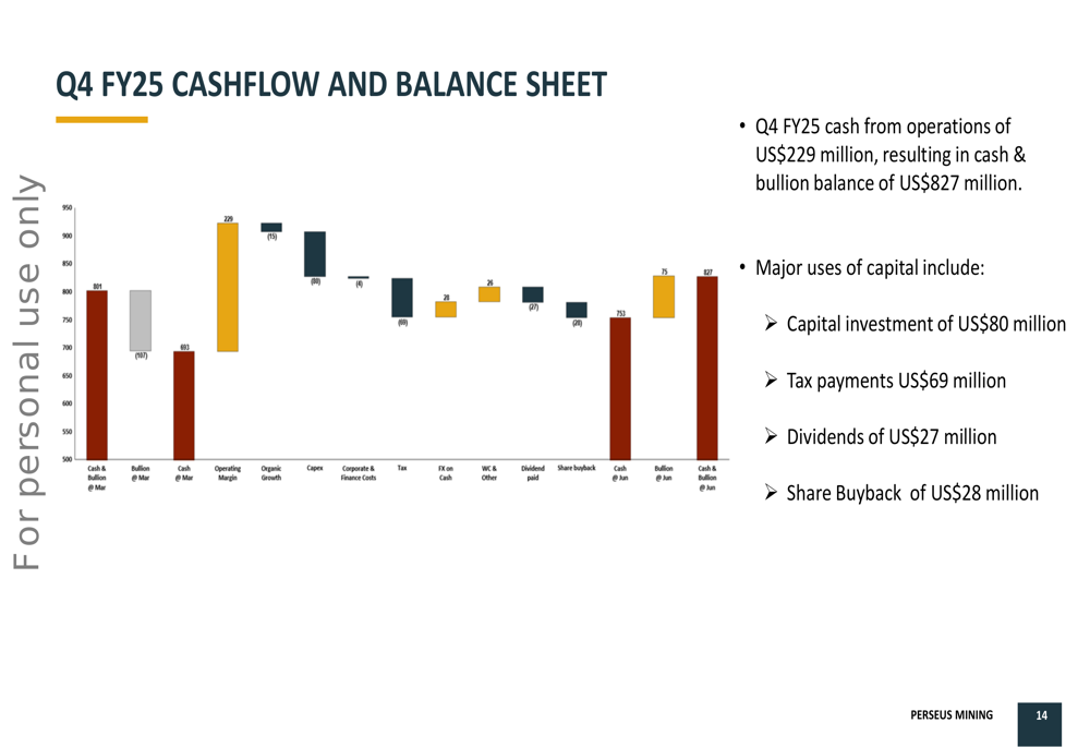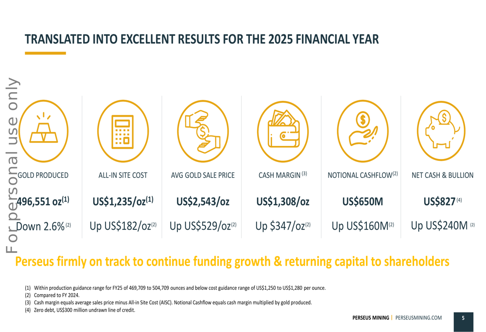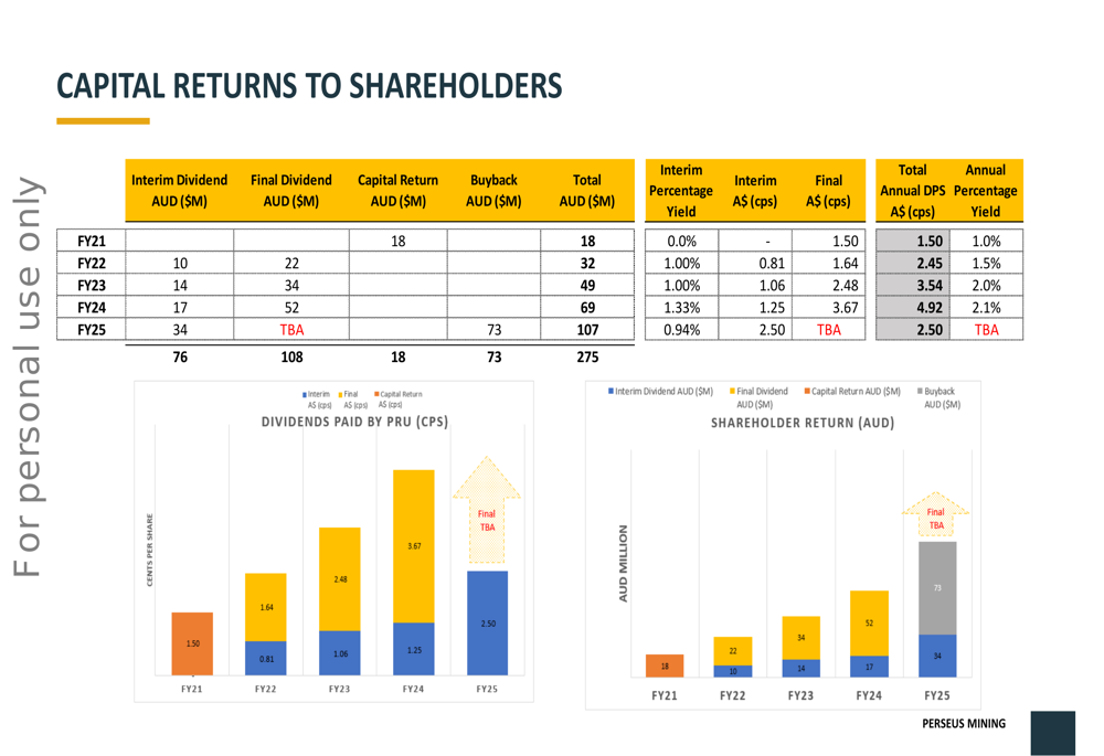 A Perseus manteve um forte foco no retorno de capital aos acionistas, com retornos totais de A$ 107 milhões no ano fiscal de 2025 e A$ 275 milhões desde o ano fiscal de 2021: