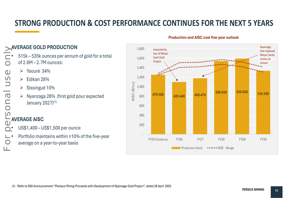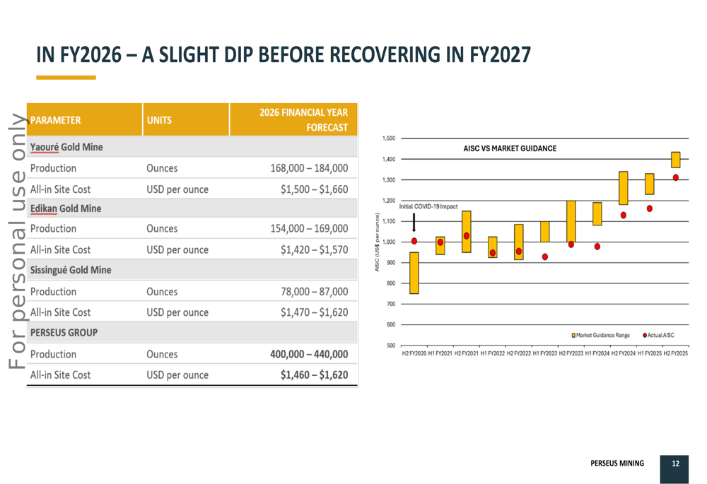 A orientação de produção da Perseus para o ano fiscal de 2026 indica uma queda temporária para 400.000-440.000 onças a um AISC de US$ 1.460-1.620 por onça antes de se recuperar no ano fiscal de 2027:
