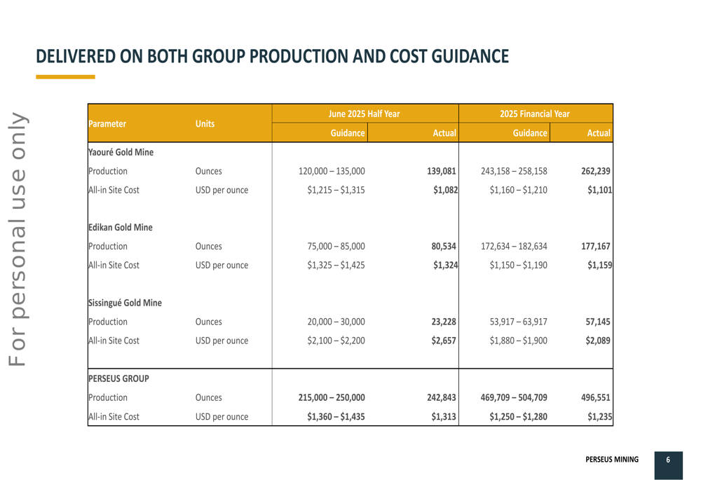 A Perseus cumpriu com sucesso suas orientações de produção e custo em todas as três minas operacionais (Yaouré, Edikan e Sissingué) tanto para os períodos semestrais quanto anuais:
