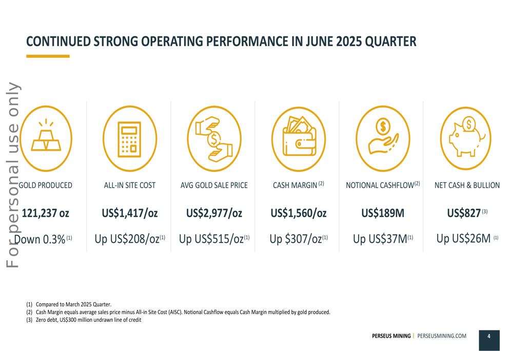 A Perseus Mining Ltd (ASX:PRU) realizou seu webinar de relatório do trimestre de junho de 2025 em 28.07.2025, destacando como a disparada dos preços do ouro impulsionou significativamente o desempenho financeiro da empresa, apesar da produção relativamente estável. A produtora de ouro, com operações em toda a África Ocidental, capitalizou condições favoráveis de mercado enquanto manteve uma gestão disciplinada de custos e avançou em projetos-chave de crescimento.