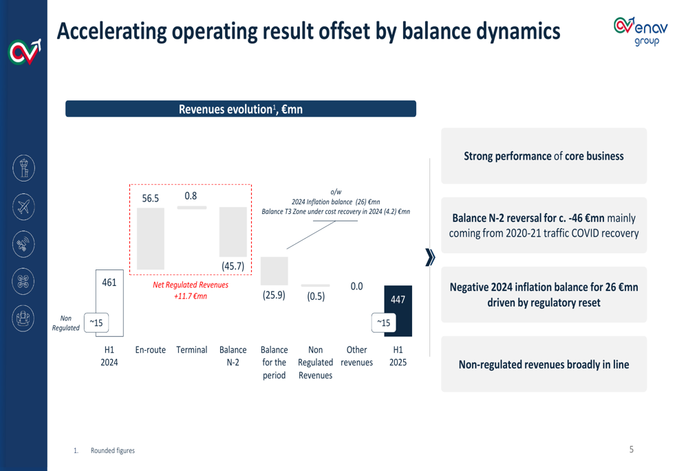 Apesar do forte crescimento do tráfego, a receita da ENAV diminuiu €14 milhões ano a ano para €447 milhões. Esta queda foi principalmente impulsionada por um impacto negativo de €45,7 milhões da reversão do balanço N-2, principalmente relacionado à recuperação do tráfego de COVID 2020-21, bem como um balanço negativo de inflação de 2024 de €26 milhões devido ao reajuste regulatório.