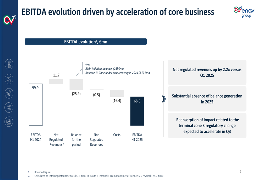 O EBITDA diminuiu de €99,9 milhões no 1º semestre de 2024 para €68,8 milhões no 1º semestre de 2025, representando uma queda de 31,1%. Esta redução foi principalmente devido à ausência de geração de balanço em 2025 e ao impacto das mudanças regulatórias na zona terminal 3, que a empresa espera acelerar no 3º tri.