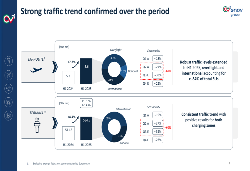 O desempenho de tráfego da ENAV permaneceu robusto no 1º semestre de 2025, com unidades de serviço en-route aumentando 7,3% para 5,6 milhões e unidades de serviço terminal crescendo 4,4% para 534,5 milhões em comparação com o 1º semestre de 2024. A composição do tráfego mostra que sobrevoos e tráfego internacional representam aproximadamente 84% do total de unidades de serviço, destacando a posição estratégica da ENAV no espaço aéreo europeu.
