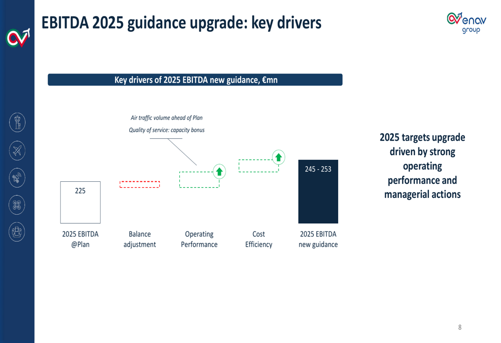 A ENAV elevou sua orientação para 2025 com base em dois principais impulsionadores: volume de tráfego aéreo excedendo o plano e bônus de qualidade de serviço. A empresa agora espera que o EBITDA alcance €245-253 milhões, um aumento significativo em relação à meta original de €225 milhões.