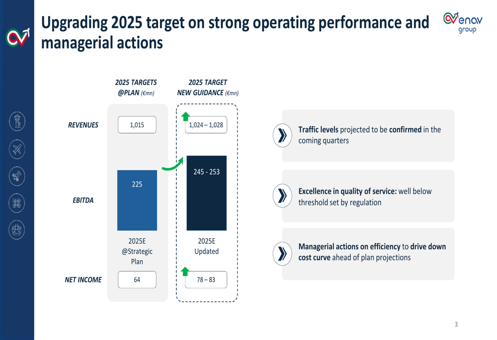 Com base no forte desempenho operacional e iniciativas de eficiência, a ENAV elevou sua orientação para 2025, projetando receitas de €1.024-1.028 milhões (acima dos €1.015 milhões anteriores), EBITDA de €245-253 milhões (acima dos €225 milhões) e lucro líquido de €78-83 milhões (acima dos €64 milhões).