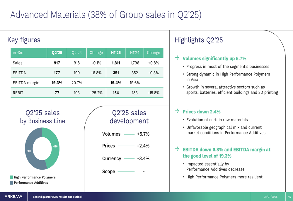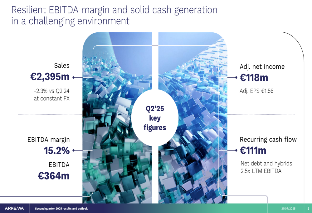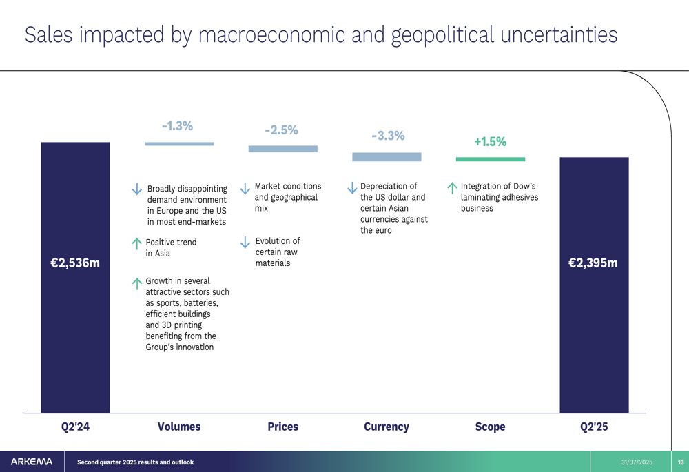 A Arkema reportou vendas de €2.395 milhões no 2º tri de 2025, uma queda de 2,3% ano a ano a taxas de câmbio constantes. O desempenho foi impactado por volumes ligeiramente menores (-1,3%) em um ambiente de demanda amplamente decepcionante na Europa e nos EUA, embora a Ásia tenha mostrado tendências mais positivas. A empresa também enfrentou um efeito negativo de preço de 2,5% e um significativo impacto cambial negativo de 3,3%, parcialmente compensado por um efeito positivo de escopo de 1,5% da integração do negócio de adesivos laminados da Dow.