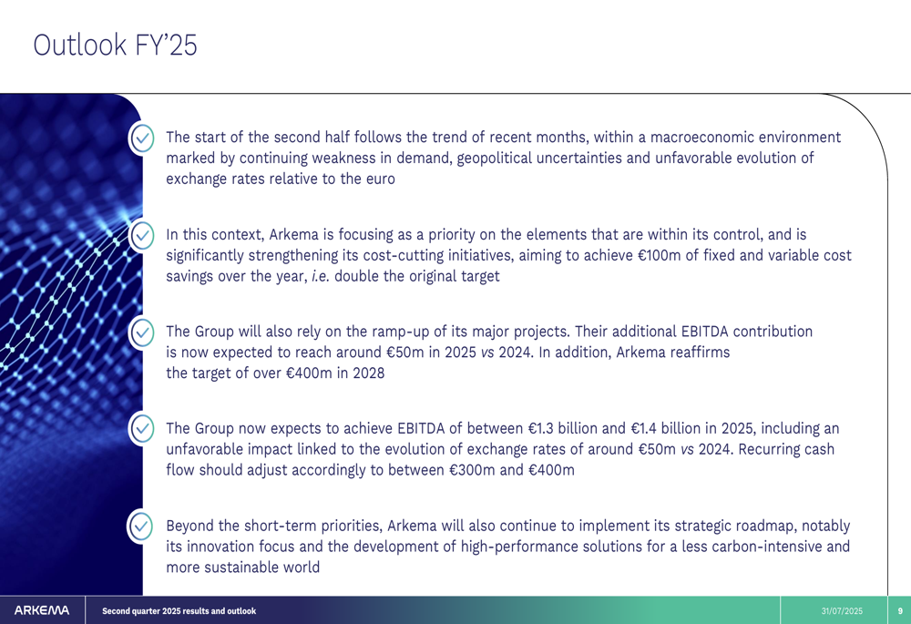 Para o ano completo de 2025, a Arkema agora espera um EBITDA entre €1,3 bilhão e €1,4 bilhão, incluindo um impacto cambial desfavorável de cerca de €50 milhões em relação a 2024. O fluxo de caixa recorrente é projetado entre €300 milhões e €400 milhões. A empresa espera uma contribuição adicional ao EBITDA de grandes projetos de cerca de €50 milhões em 2025 em comparação com 2024, enquanto reafirma a meta de longo prazo de mais de €400 milhões até 2028.