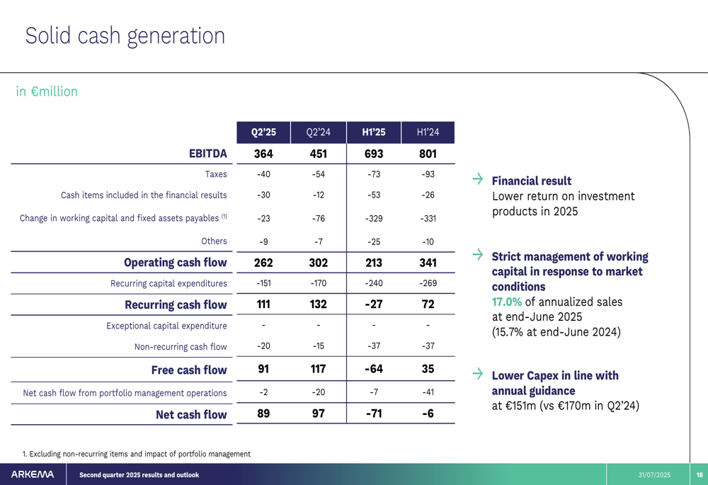 A empresa manteve sólida geração de caixa com fluxo de caixa recorrente de €111 milhões no 2º tri de 2025, apesar do ambiente desafiador. A Arkema está implementando gestão rigorosa do capital de giro, que representava 17,0% das vendas anualizadas no final de junho de 2025, em comparação com 15,7% no ano anterior.
