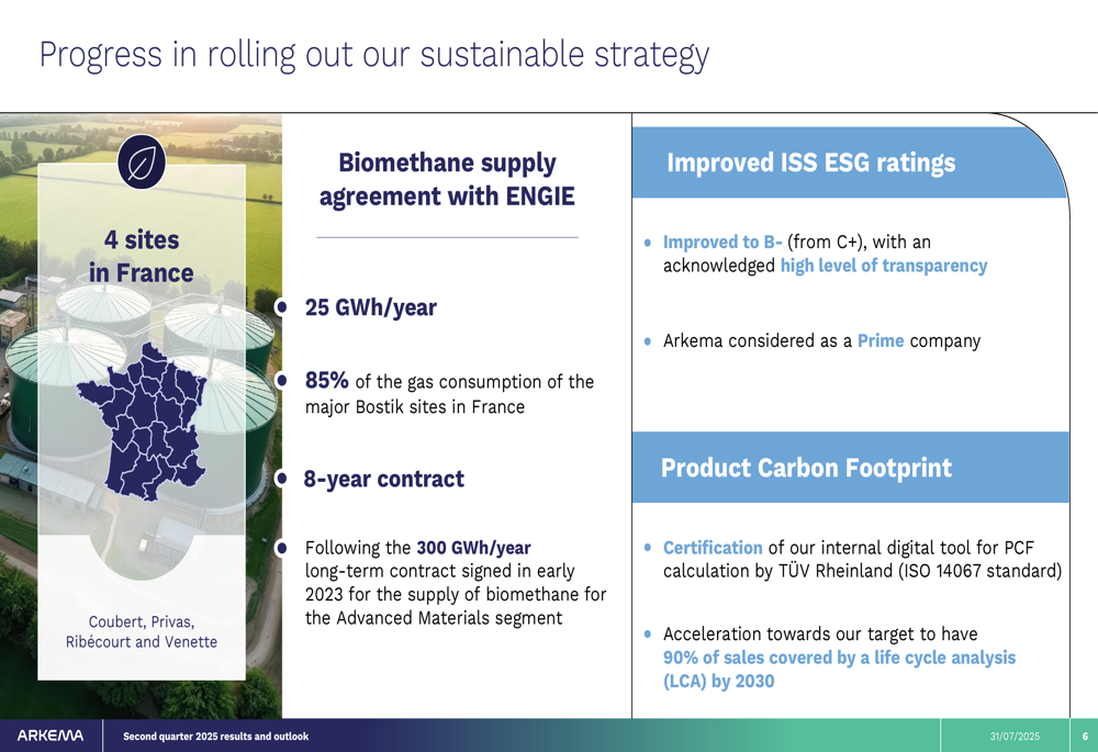 A Arkema também está avançando em sua estratégia de sustentabilidade, anunciando um acordo de fornecimento de biometano com a ENGIE cobrindo 4 sites na França e representando 85% do consumo de gás dos principais sites da Bostik no país. A empresa melhorou sua classificação ISS ESG para B- de C+ e recebeu certificação de sua ferramenta digital interna para cálculo da pegada de carbono de produtos pela TÜV Rheinland.