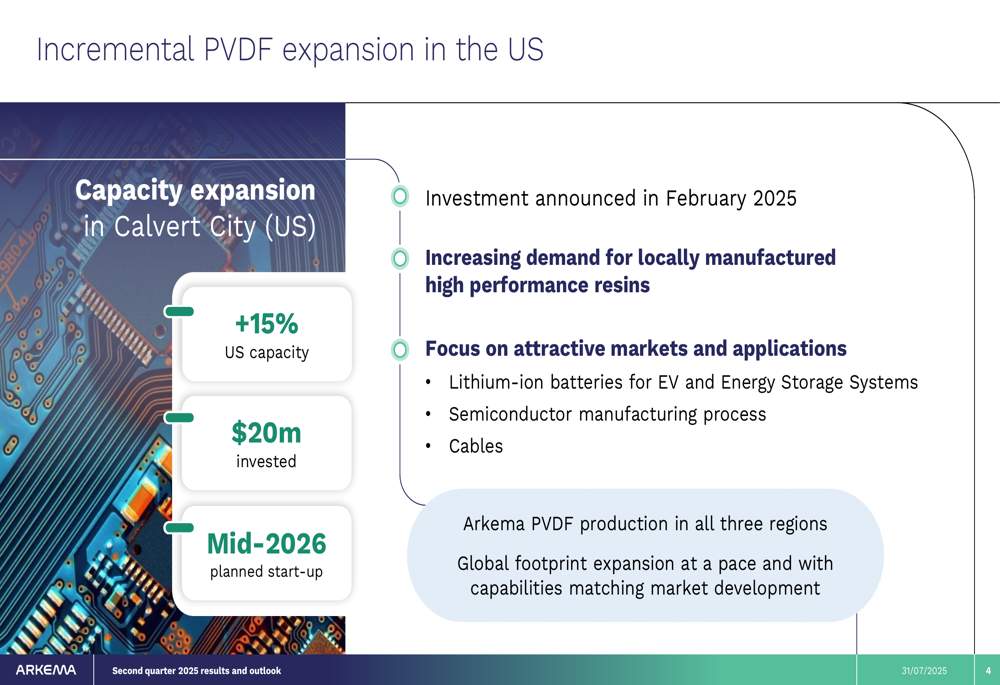 Adicionalmente, a Arkema está expandindo sua capacidade de PVDF em Calvert City, EUA, com um investimento de US$ 20 milhões para aumentar a capacidade dos EUA em 15%, visando a crescente demanda em baterias de íon-lítio, fabricação de semicondutores e cabos.