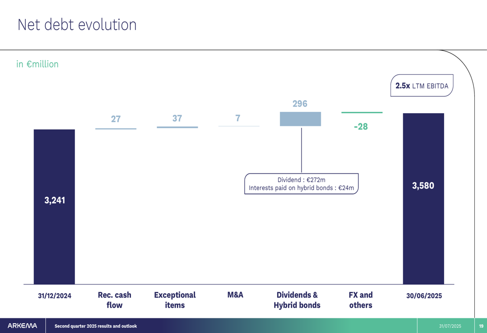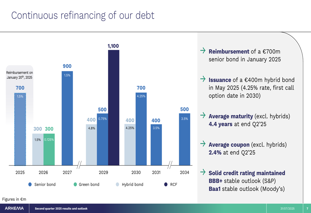 A Arkema continua a gerenciar proativamente seu perfil de dívida, reembolsando um título sênior de €700 milhões em janeiro de 2025 e emitindo um título híbrido de €400 milhões em maio de 2025. A empresa manteve uma sólida classificação de crédito de BBB+ com perspectiva estável (S&P) e Baa1 com perspectiva estável (Moody’s).