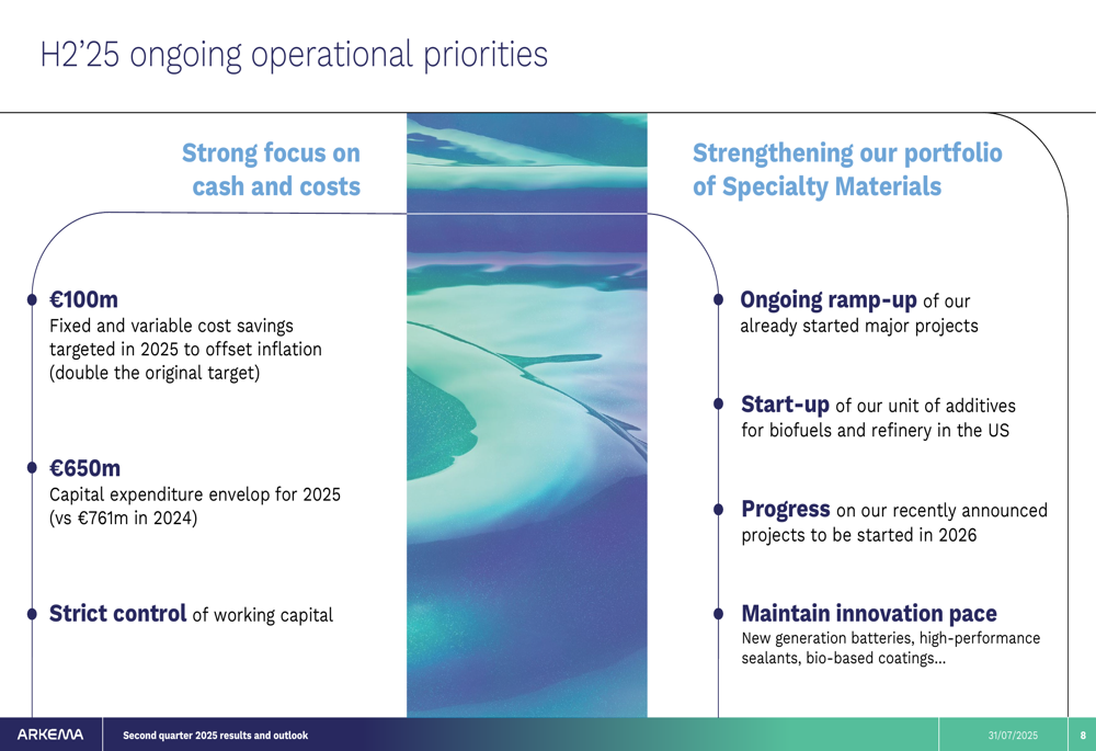 Em resposta aos contínuos desafios de mercado, a Arkema fortaleceu significativamente suas iniciativas de redução de custos, dobrando sua meta para €100 milhões em economias de custos fixos e variáveis para 2025. A empresa também está mantendo controle rigoroso do capital de giro e estabeleceu um envelope de despesas de capital de €650 milhões para 2025, abaixo dos €761 milhões em 2024.