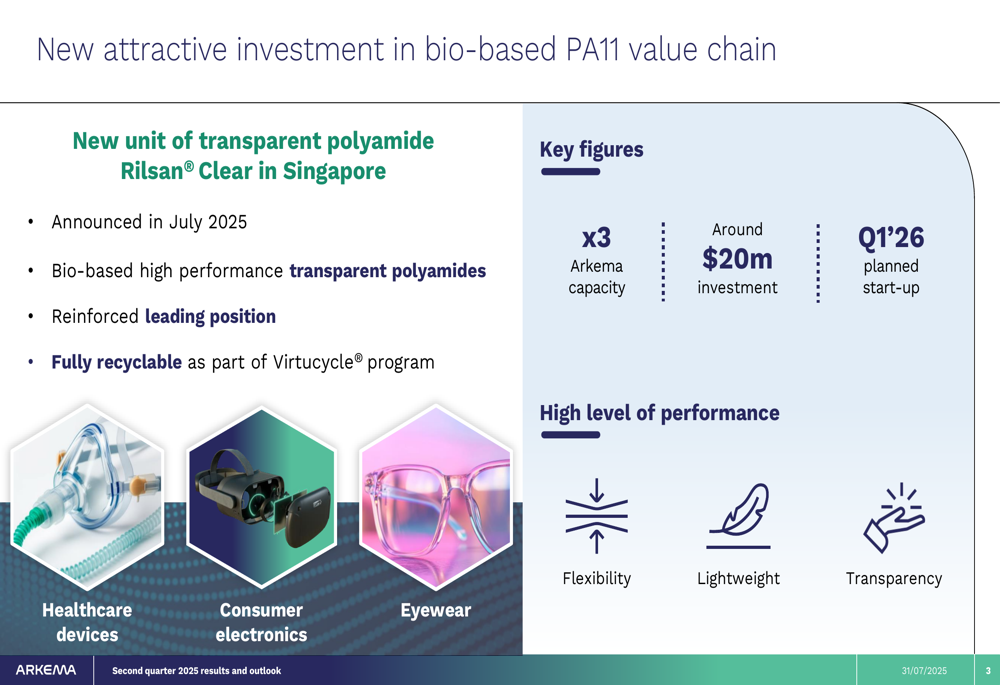 Apesar dos desafios de mercado de curto prazo, a Arkema continua investindo em áreas de crescimento estratégico. Em julho de 2025, a empresa anunciou uma nova unidade para poliamida transparente Rilsan® Clear em Singapura, representando um investimento de US$ 20 milhões com início planejado para o 1º tri de 2026. Esta expansão triplicará a capacidade da Arkema para esses materiais de alto desempenho de base biológica usados em dispositivos de saúde, eletrônicos de consumo e óculos.