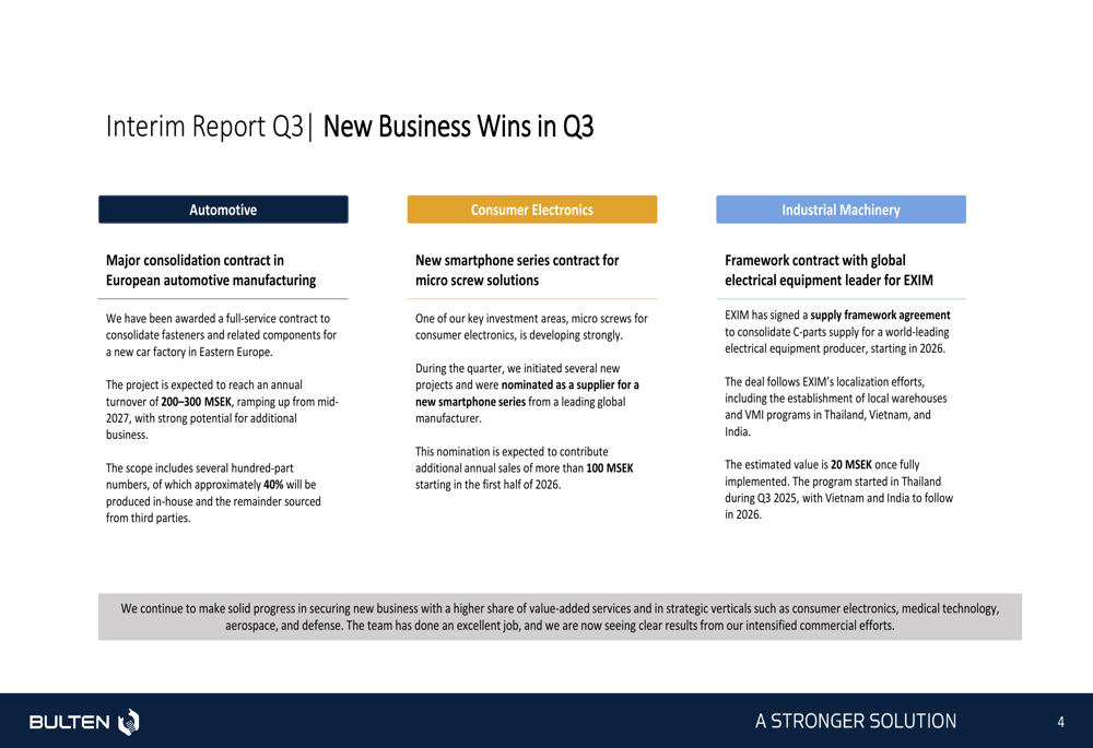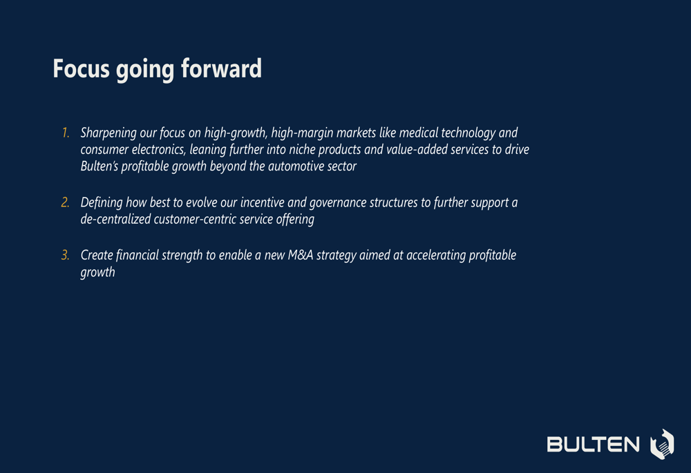Olhando para o futuro, a Bulten delineou três áreas-chave de foco para crescimento futuro:
