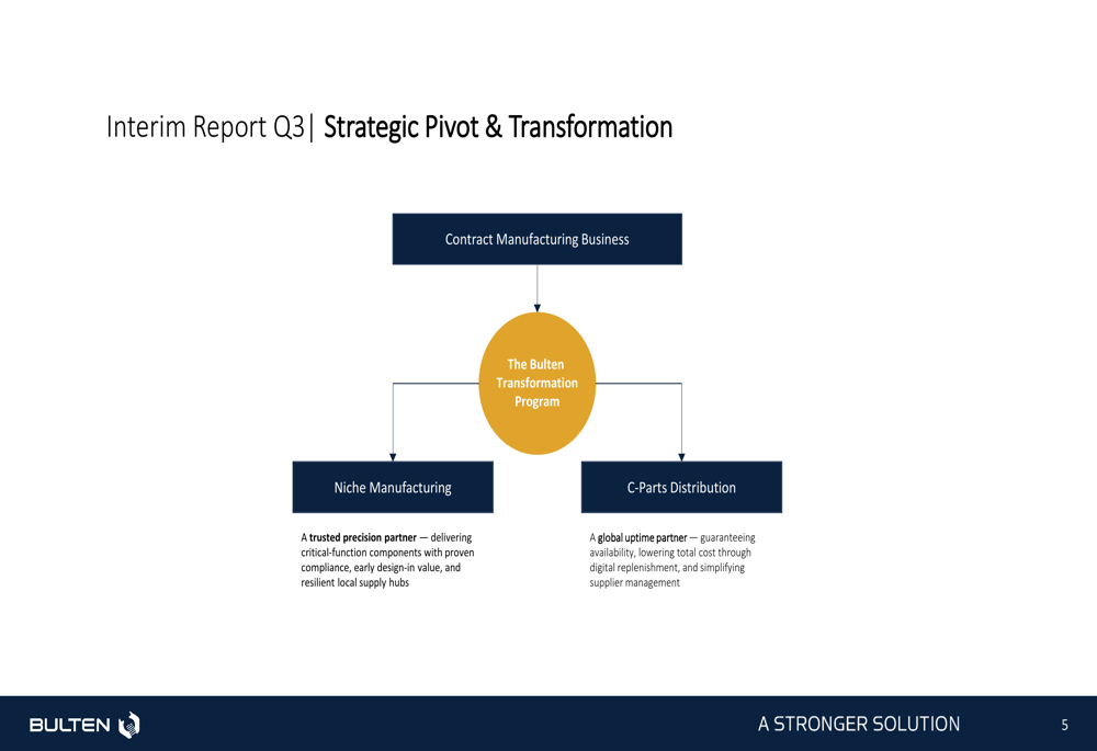 A transformação estratégica da Bulten está centrada na mudança da fabricação contratual tradicional para a fabricação de nicho de maior valor e serviços de distribuição de peças C, como ilustrado em seu framework estratégico: