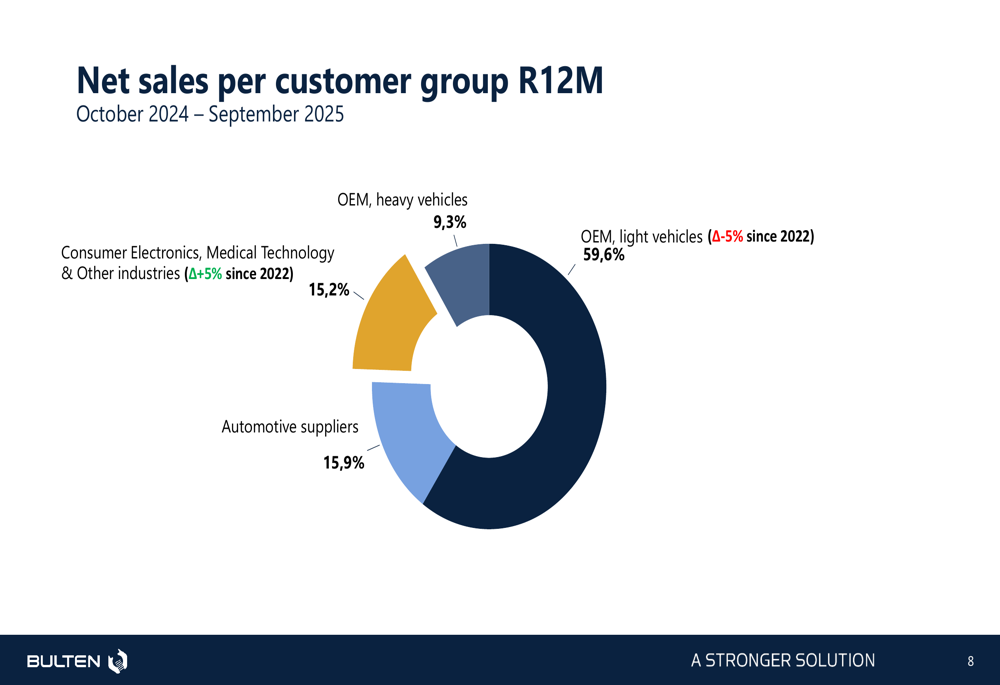 O setor automotivo continua sendo o maior gerador de receita da Bulten, mas a empresa está ativamente mudando seu mix de clientes. A apresentação mostrou que as montadoras de veículos leves agora representam 59,6% das vendas dos últimos 12 meses, uma diminuição de 5% desde 2022, enquanto Eletrônicos de Consumo, Tecnologia Médica e Outras indústrias aumentaram para 15,2%, um ganho de 5% no mesmo período.