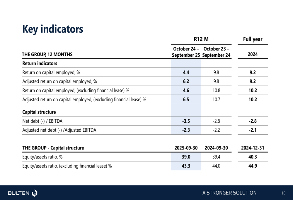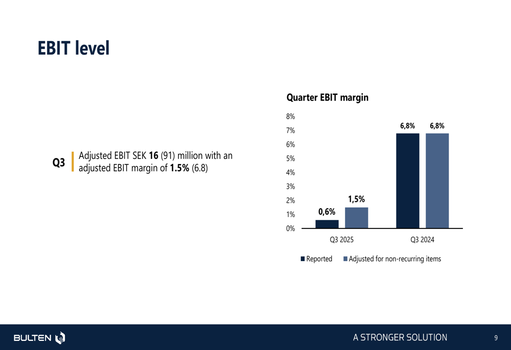 A Bulten reportou uma queda substancial de 22,4% nas vendas líquidas no 3º tri 2025 em comparação ao ano anterior, principalmente atribuída a um grande ataque cibernético que afetou um cliente-chave. De acordo com a transcrição da teleconferência de resultados, essa interrupção resultou em aproximadamente SEK 200 milhões em receita perdida durante o trimestre.