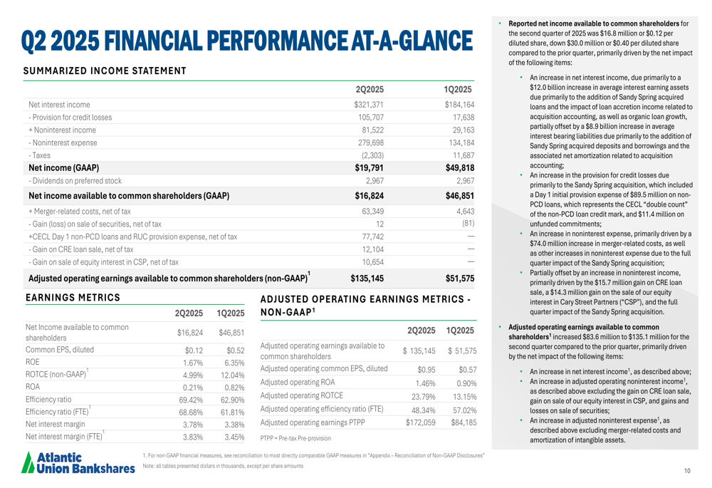 A Atlantic Union reportou lucro líquido GAAP disponível para acionistas ordinários no 2º tri de 2025 de US$ 16,8 milhões, ou US$ 0,12 por ação diluída, comparado a US$ 46,9 milhões, ou US$ 0,52 por ação no 1º tri de 2025. No entanto, o lucro operacional ajustado disponível para acionistas ordinários alcançou US$ 135,1 milhões, com a diferença significativa principalmente atribuída aos custos relacionados à fusão de US$ 78,9 milhões associados à aquisição da Sandy Spring.