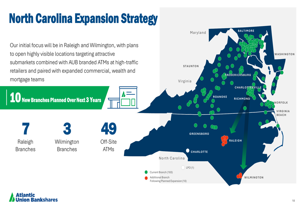 Um pilar fundamental da estratégia de crescimento da Atlantic Union é sua expansão para a Carolina do Norte, focando inicialmente nos mercados de Raleigh e Wilmington. O banco planeja abrir 10 novas agências nos próximos três anos (7 em Raleigh e 3 em Wilmington), complementadas pela instalação de 49 caixas eletrônicos externos para aumentar a conveniência dos clientes.