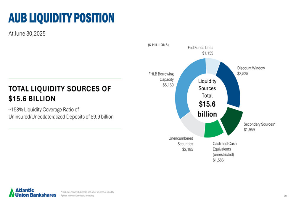 A base de depósitos da Atlantic Union continua sendo um ponto forte, com depósitos totais de US$ 31,0 bilhões e uma relação favorável de empréstimos para depósitos de 88,2%. Os depósitos principais representam 93% do total, com 45% em contas transacionais. O custo dos depósitos diminuiu para 2,20% no 2º tri de 2025, de 2,29% no 1º tri de 2025, contribuindo para a melhoria da margem líquida de juros.