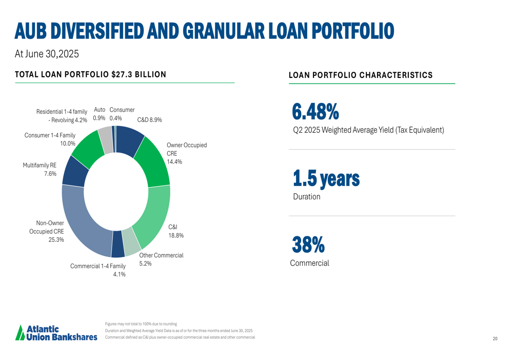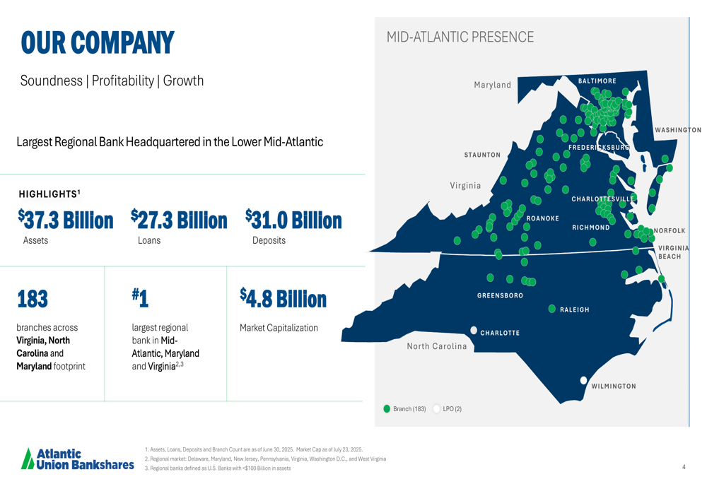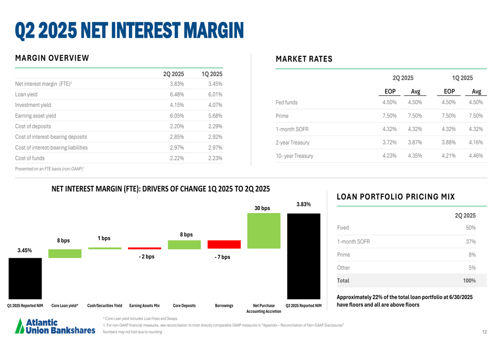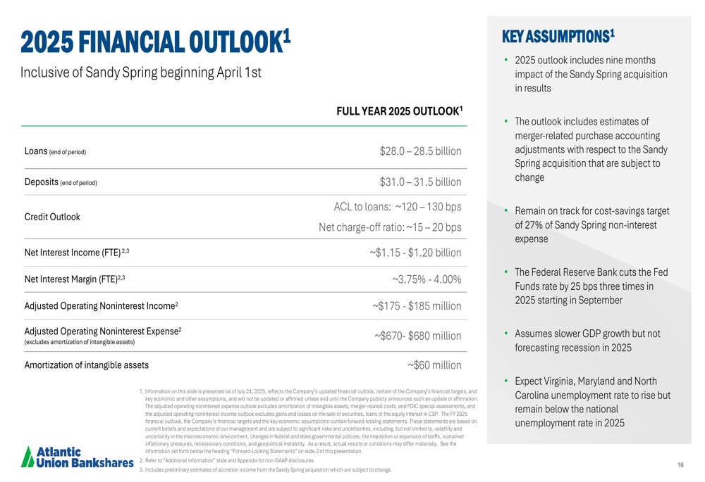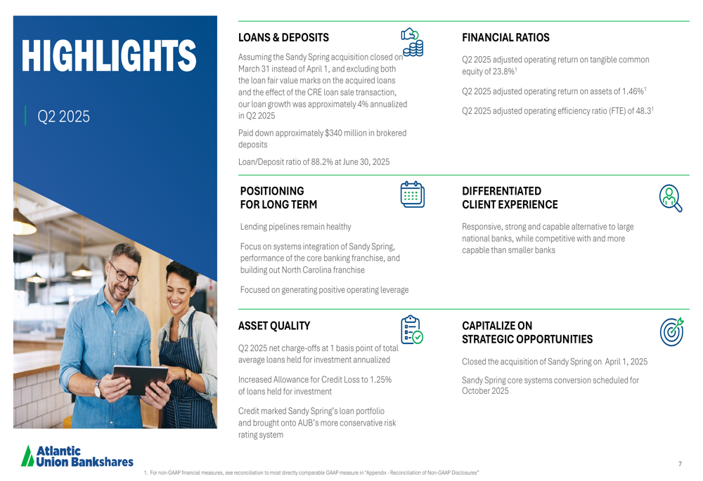 Atlantic Union Bankshares (Nova York:AUB), o maior banco regional com sede no Baixo Meio-Atlântico, apresentou seus resultados do segundo trimestre de 2025 em 24 de julho de 2025. O banco reportou crescimento significativo em métricas-chave, impulsionado pela recente aquisição da Sandy Spring Bancorp, concluída em 1º de abril de 2025. Com US$ 37,3 bilhões em ativos, US$ 27,3 bilhões em empréstimos e US$ 31,0 bilhões em depósitos, a Atlantic Union continua fortalecendo sua posição nos mercados da Virgínia, Carolina do Norte e Maryland.