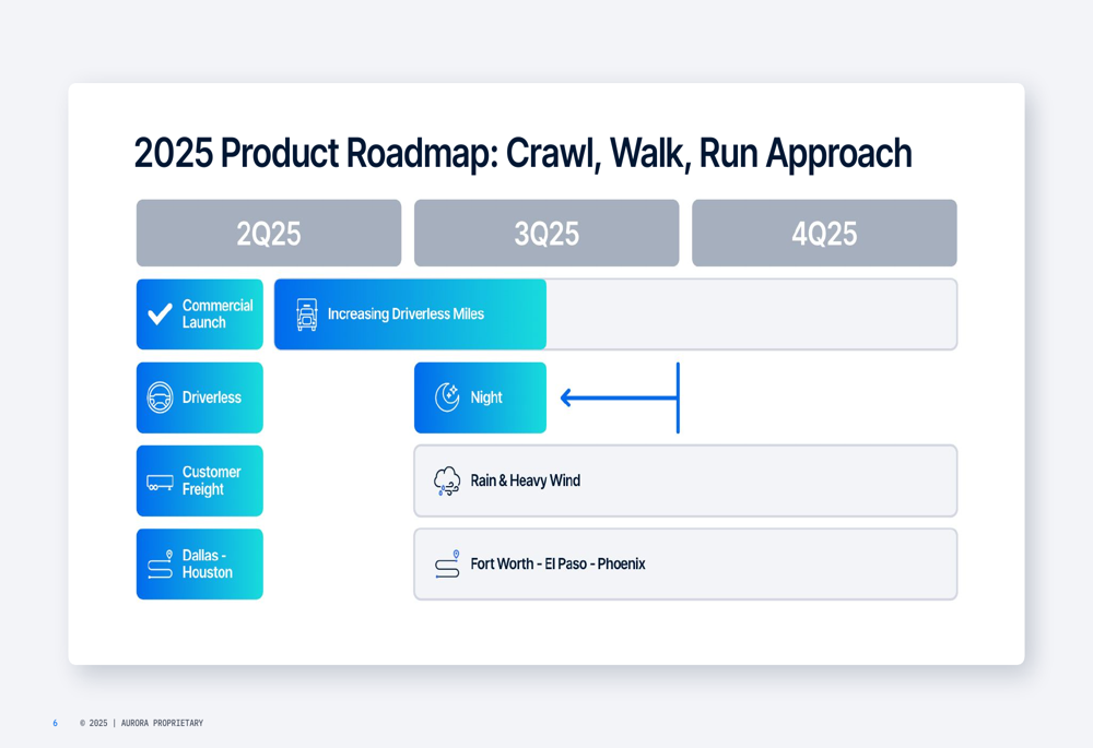 A Aurora delineou uma clara abordagem "Engatinhar, Andar, Correr" para seu roteiro de produtos de 2025. Após o lançamento comercial do 2º tri entre Dallas e Houston, a empresa planeja expandir para operações noturnas e condições climáticas desafiadoras no 3º tri, seguido pela expansão de rota para Fort Worth-El Paso-Phoenix até o 4º tri.