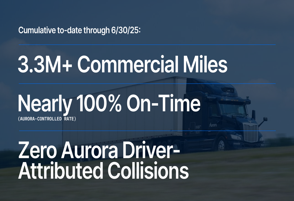 O 2º tri de 2025 da Aurora foi definido pelo lançamento de suas primeiras operações comerciais de caminhões sem motorista. A empresa relatou que seu sistema autônomo, o Aurora Driver, registrou mais de 20.000 milhas sem motorista até 30 de junho de 2025, equivalente a mais de oito viagens de costa a costa pelos Estados Unidos.