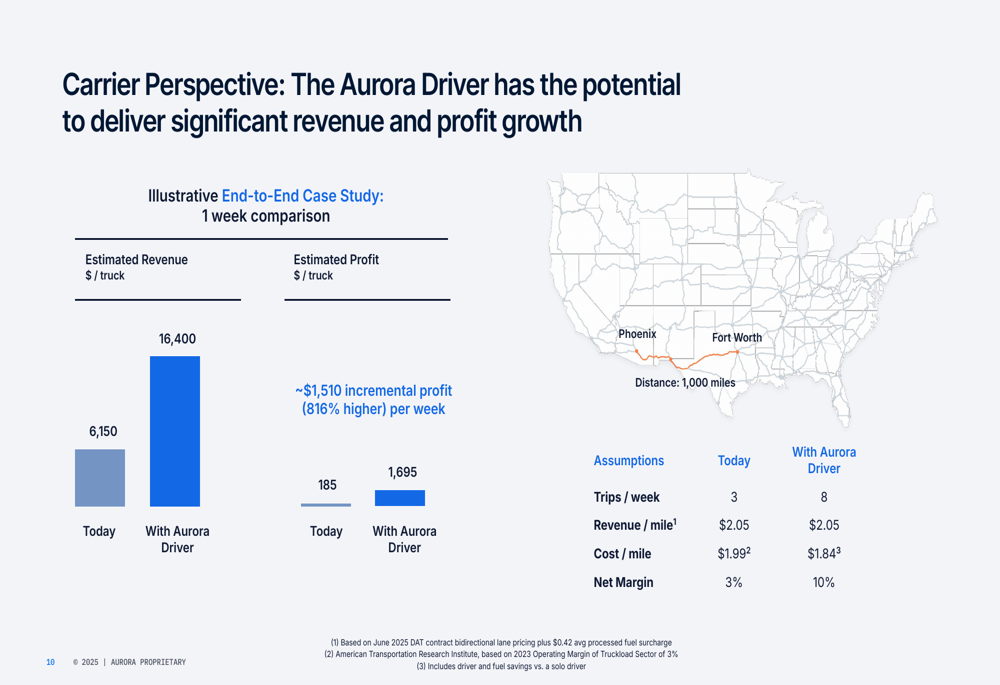 A empresa apresentou um estudo de caso convincente para transportadoras, mostrando crescimento potencial de receita de US$ 6.150 para US$ 16.400 por semana e aumentos de lucro de US$ 185 para US$ 1.695 por semana—representando uma melhoria de 816%—ao usar o Aurora Driver em uma rota de Phoenix a Fort Worth. Estas projeções são baseadas no aumento de viagens por semana (de 3 para 8) e redução do custo por milha (de US$ 1,99 para US$ 1,84).